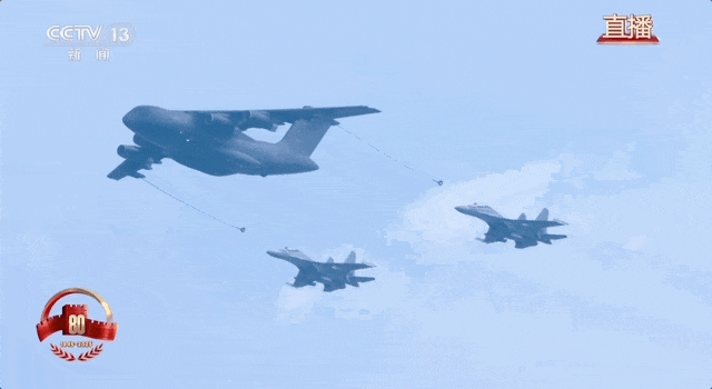 阅兵现场,为战鹰助力,为胜利续航,加受油机梯队飞临天安门上空,三架运油-20A时刻准备为轰-6N、歼-16、歼-20飞机加油。